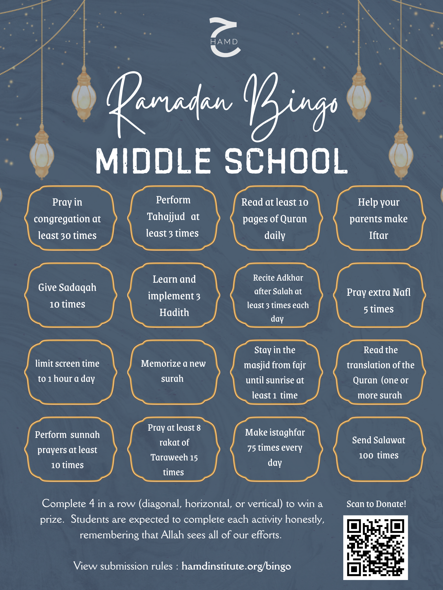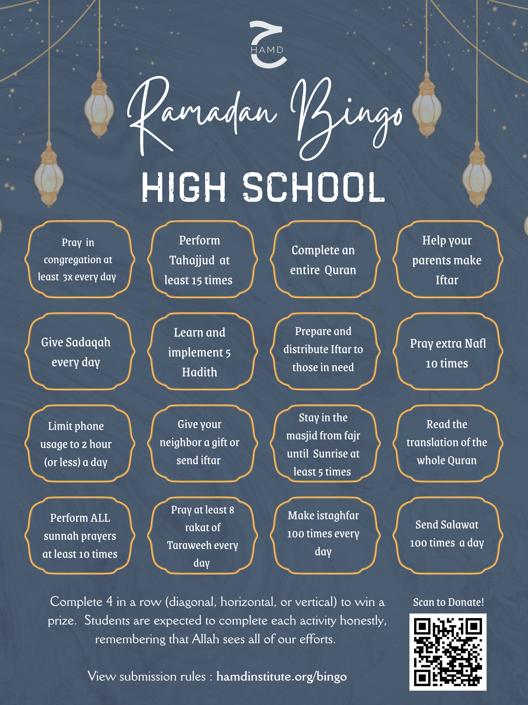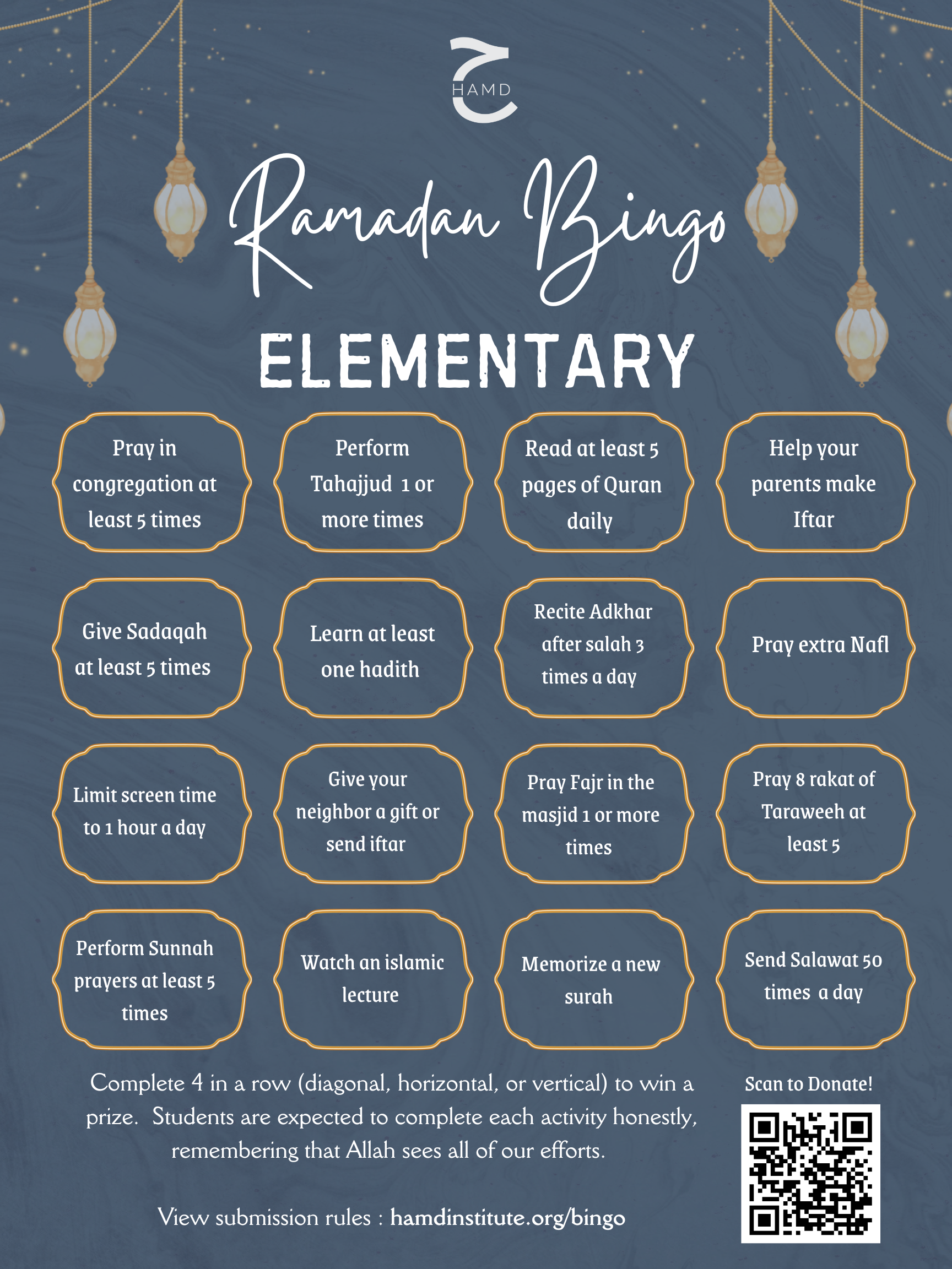 Each student will receive a Ramadan Bingo board filled with different good deeds and acts of worship. Complete each square by performing the activity listed. You may only mark a square after you have sincerely completed the deed. The goal is to complete a full row, column, or diagonal to get BINGO. Students who complete BINGO must show proof of completion by posting photos/timestamps. Continue completing more squares even after getting BINGO to earn additional rewards. The students who complete bingo will be entered into a raffle to win a prize!